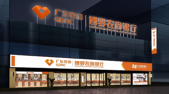 最常见的是这种平整的门头,这种门头主要以广东农信LOGO标识、农商银行标识以及24小时自助服务组成,面板由乳白色亚克力板和农信橙为主,长度随位置调整空白区域。